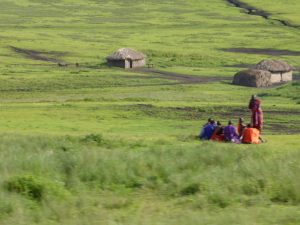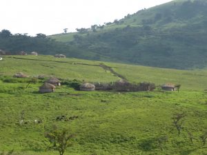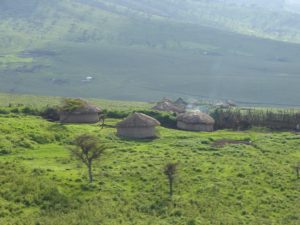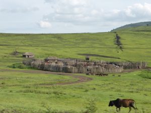 - Masai village in the conservation area and domesticated cattle.